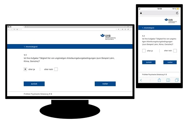 Online: Betriebe, die bei der UVB versichert sind, können unsere kostenlose online Plattform für den Einsatz der 22 Fragen nutzen. Melden Sie sich dazu gerne an gesundheit@uv-bund-bahn.de
