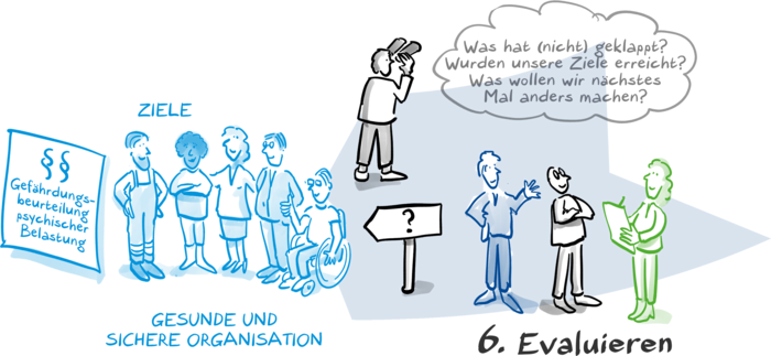 Sie haben Maßnahmen entwickelt und dokumentiert, wer was bis wann umsetzt? Dann bleiben Sie dran und behalten im Blick, wie die Umsetzung funktioniert. Wenn Maßnahmen schon eine Weile laufen, sollten Sie diese evaluieren, zum Beispiel, indem Sie Beteiligte persönlich oder schriftlich fragen, wie es ihnen mit den Änderungen geht. Um übergreifende Entwicklungen in Ihrer Organisation zu erkennen, bietet es sich an, den MOLA-Fragebogen alle 3 bis 4 Jahre einzusetzen.